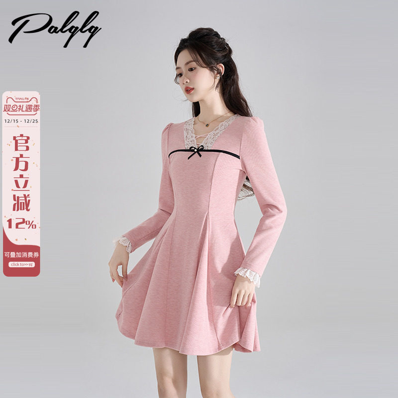法式拼接蕾丝v领粉色针织连衣裙女春装小香风收腰显瘦打底a字裙子