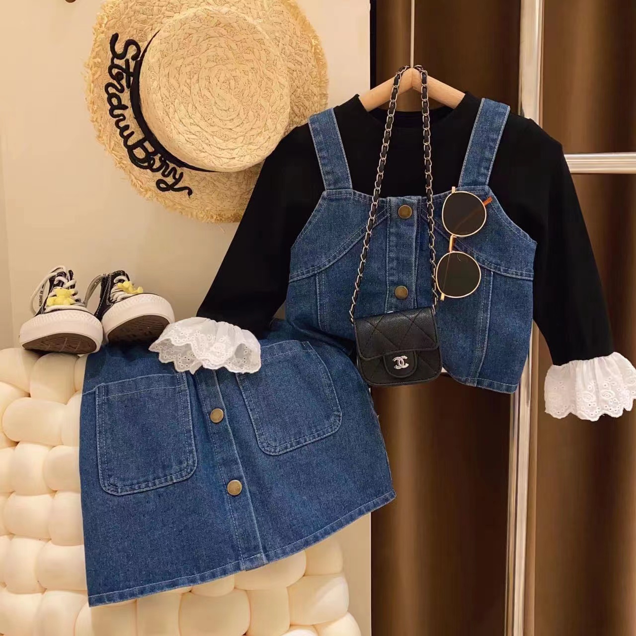 女童单排扣吊带牛仔短裙套装2023韩韩良品新款春装时尚儿童打底衫