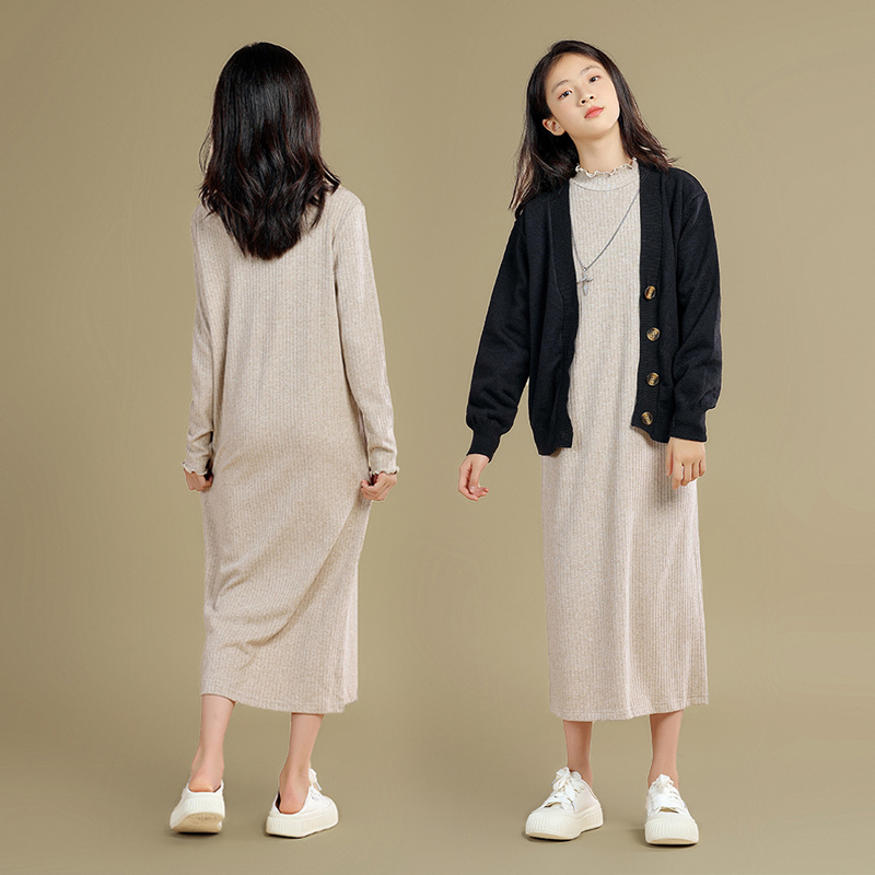 中大童女装长款打底针织连衣裙儿童春装宽松内搭慵懒风奶油色长裙