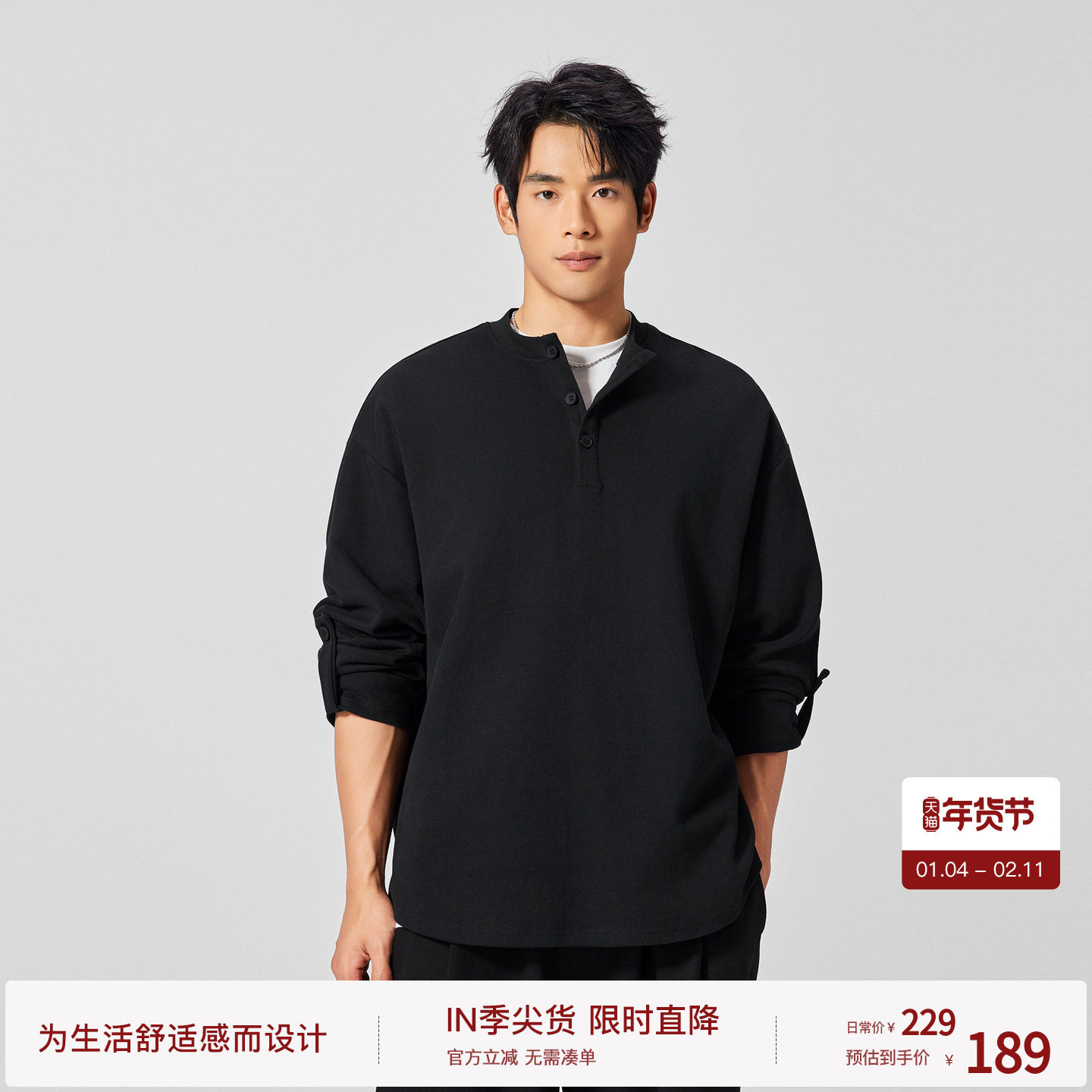 BODYDREAM亨利领长袖男T恤智性通勤citywalk打底衫/袖筒活动袢