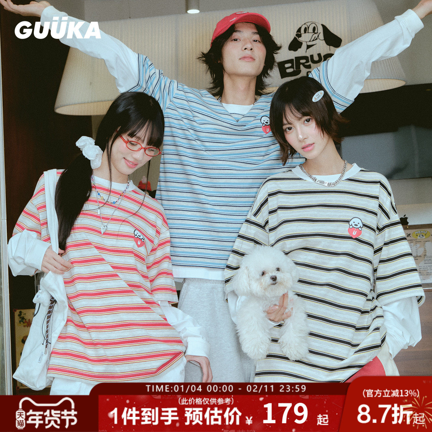 杨博文同款GUUKA&matsui联名小狗假两件长袖男t恤 秋情侣条纹上衣