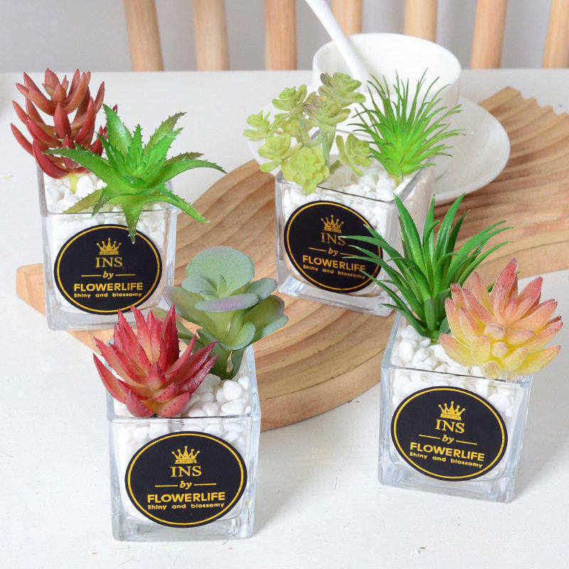 INS风仿真多肉植物小盆栽四方玻璃盆办公室桌面阳台装饰创意摆件