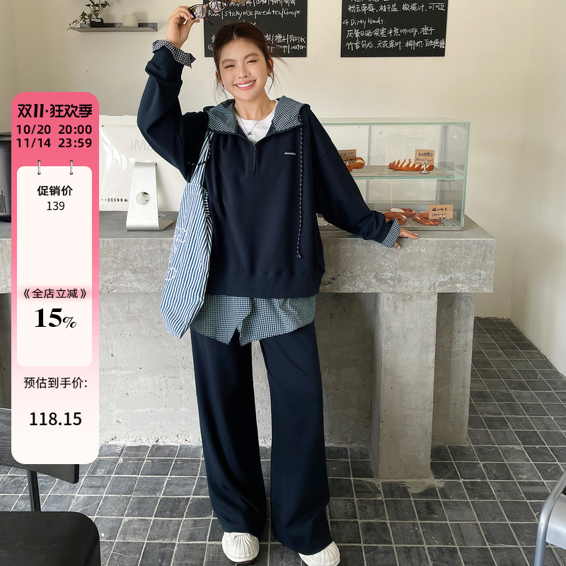 大码女装胖mm韩系早秋独特超好看套装女假两件连帽卫衣裤子两件套
