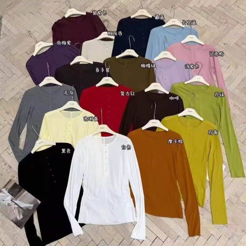 闰熙家4620-6韩国棉排扣设计修身显瘦圆领长袖T恤打底衫女糖果色