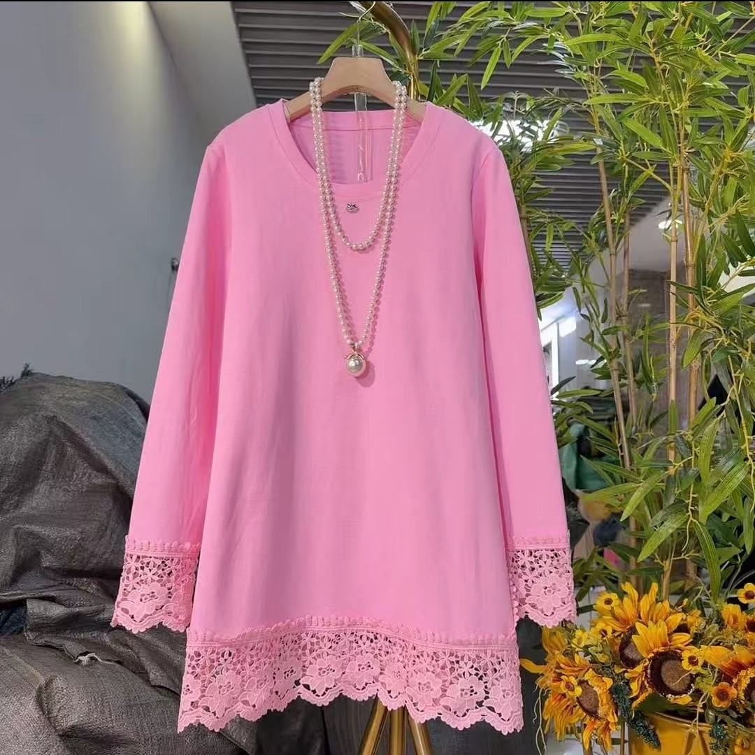 糖果色圆领拼接蕾丝花边下摆长袖t恤女装宽松韩版中长款上衣大衫