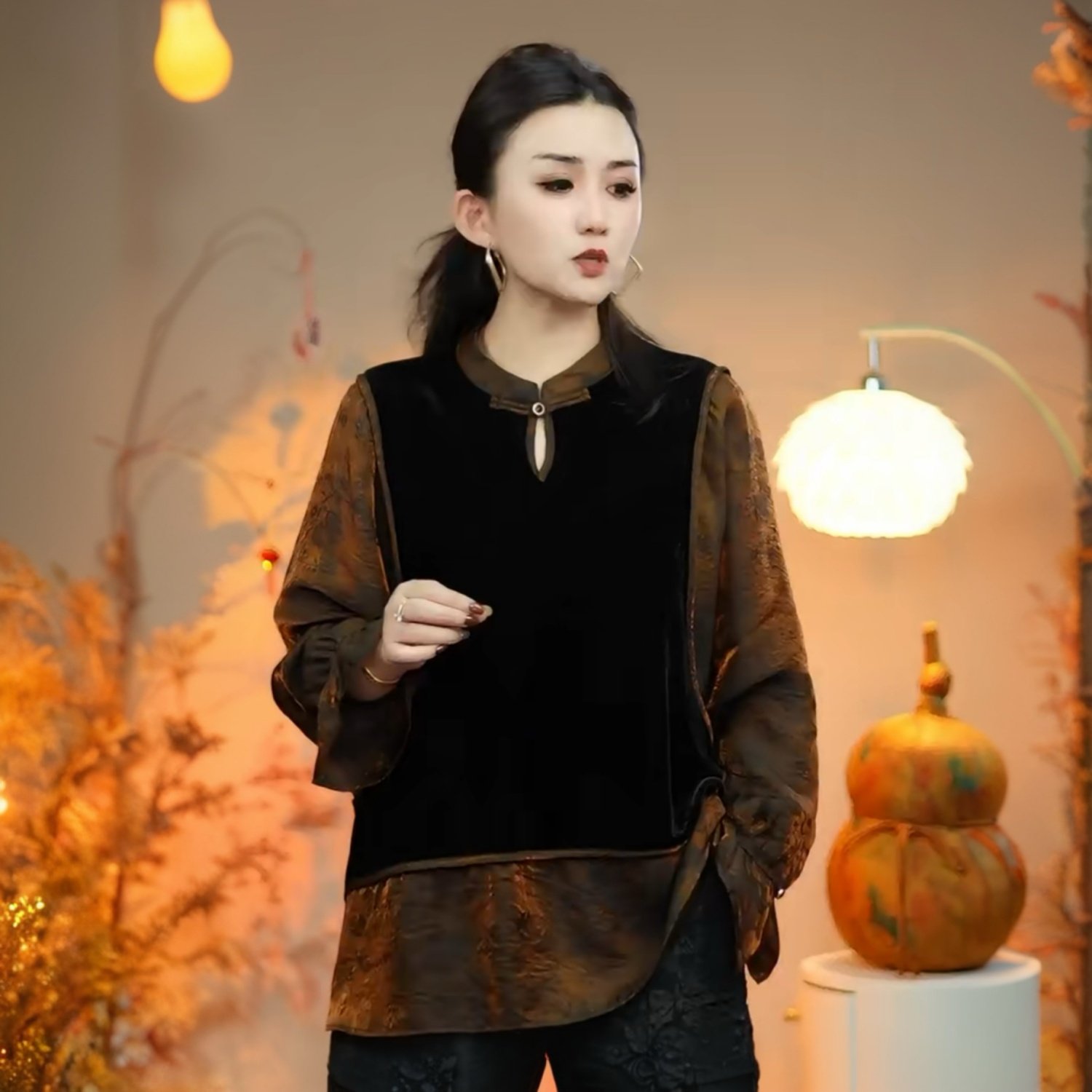 时尚妈妈假两件上衣春装新款喇叭袖丝绒拼接洋气大码休闲打底小衫