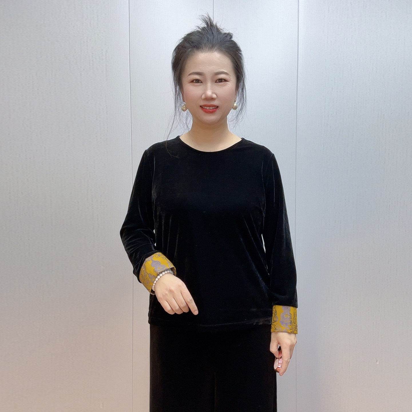 时尚妈妈丝绒小衫春装新款撞色设计大码遮肚显瘦圆领黑色打底衫女