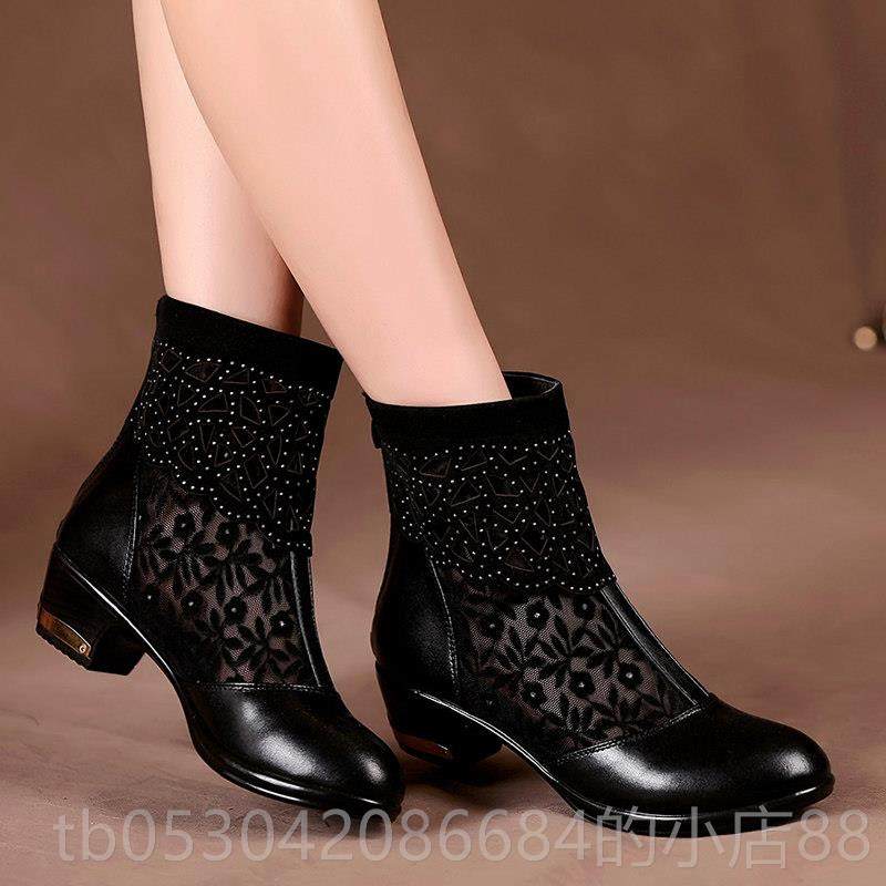 2025新款女靴中跟真皮网纱靴高跟靴子粗跟短靴女镂空网鞋春秋单靴
