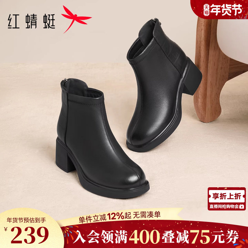 红蜻蜓妈妈鞋冬季新款女鞋超软羊皮短靴洋气中年女士皮鞋高跟靴子