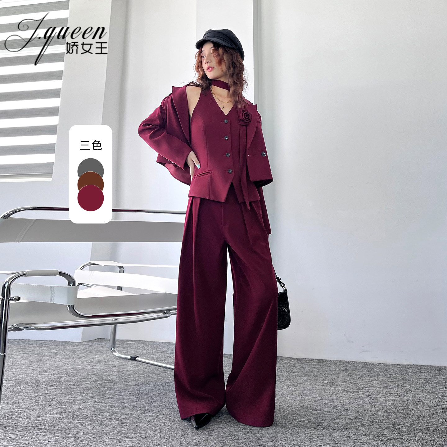 职场轻奢西装套装女春秋季马夹阔腿裤三件套休闲绑带面试装小西服