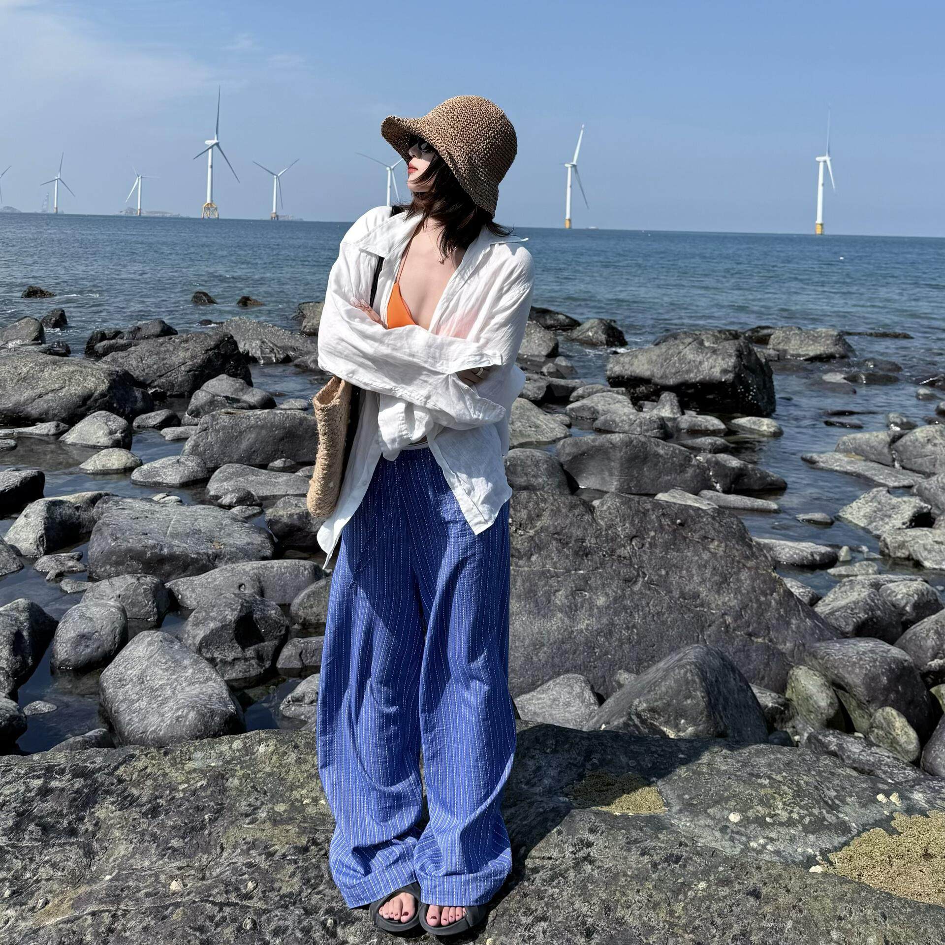 泰国海岛度假风休闲沙滩套装女白色防晒衬衫阔腿长裤比基尼三件套