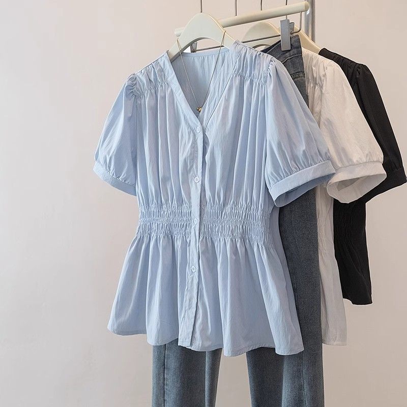 大码胖妹妹不规则V领衬衫女士设计感小众夏装新款泡泡短袖上衣服