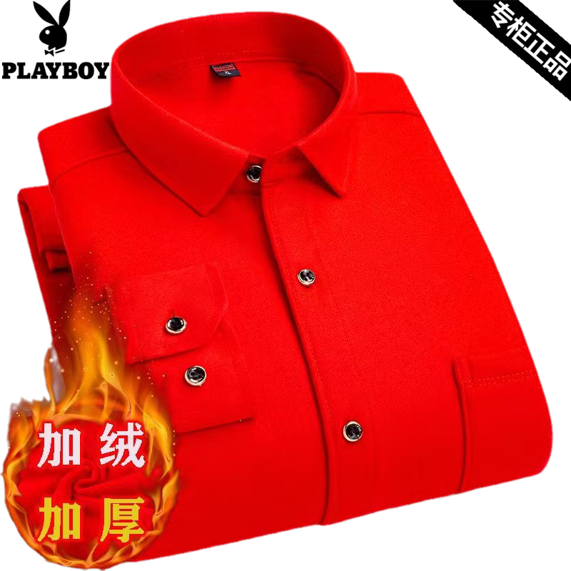 花花公子红色保暖衬衫男加绒加厚衬衣结婚宴会喜公公本命年爸爸装
