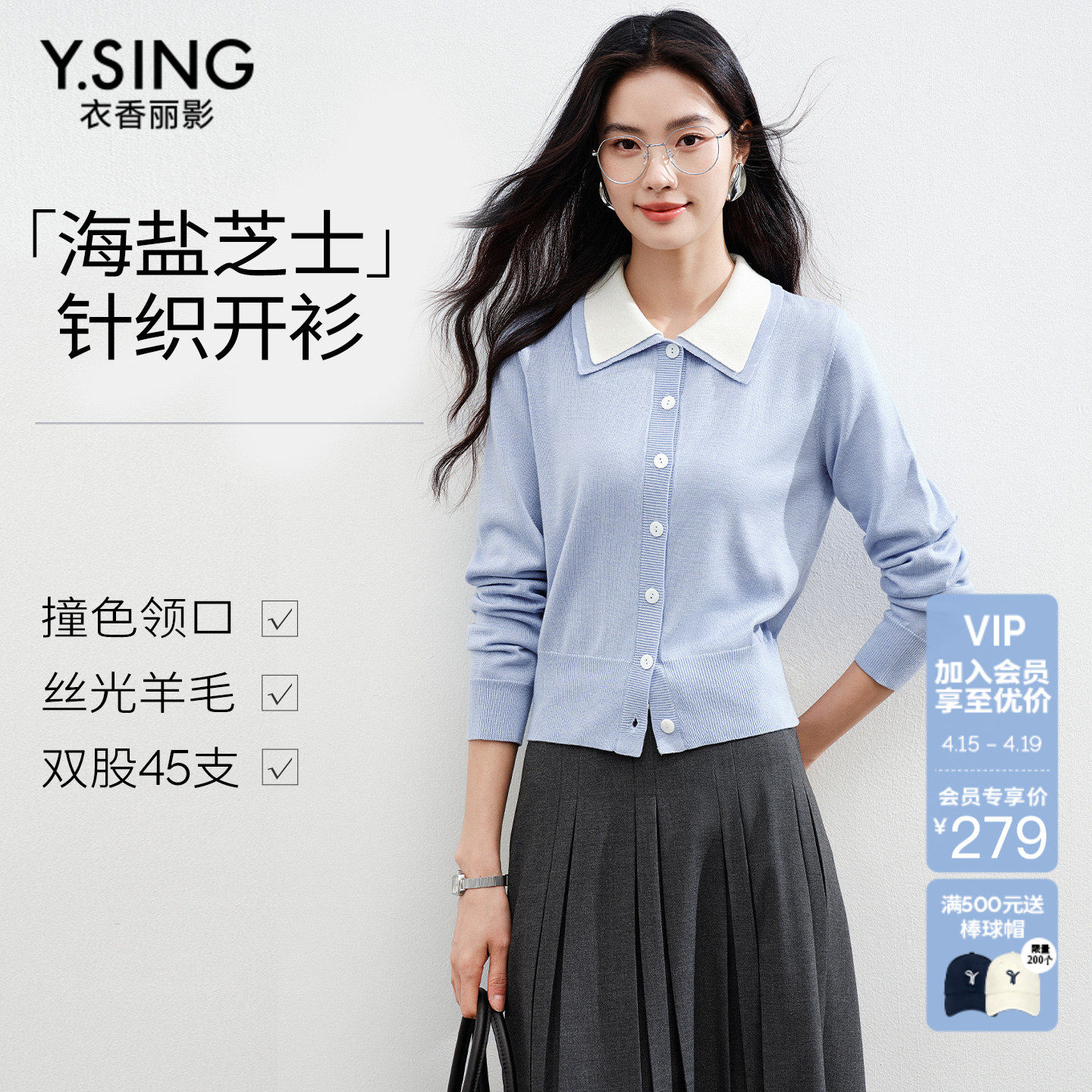 衣香丽影蓝色翻领新款上衣撞色丝光羊毛轻薄针织开衫春装女款2026