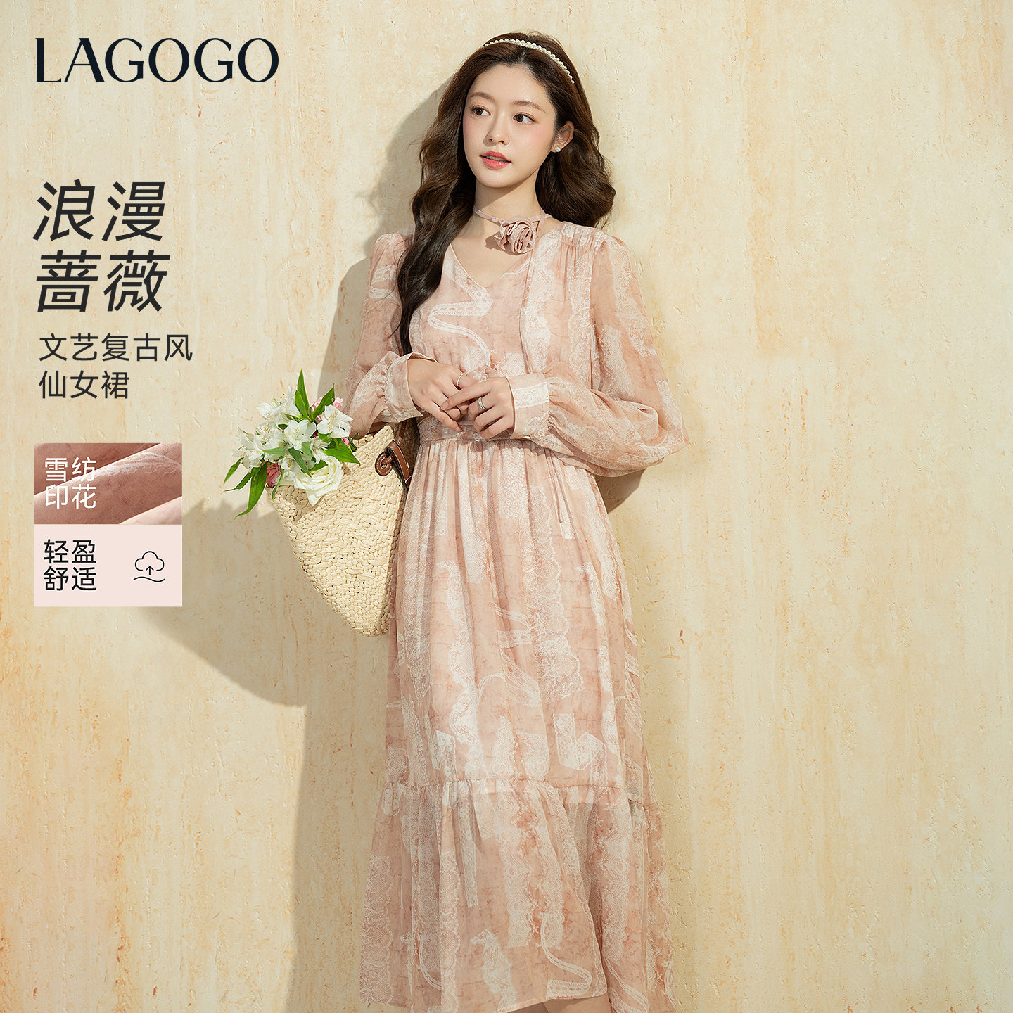 LAGOGO浪漫蔷薇雪纺连衣裙女拉谷谷2026春新款蕾丝印花温柔气质裙