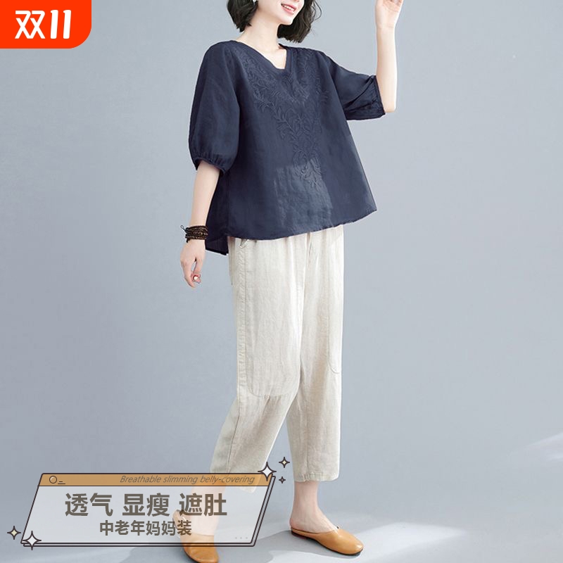 棉麻阔腿裤套装女夏宽松时尚妈妈装中国民族风复古刺绣棉麻两件套