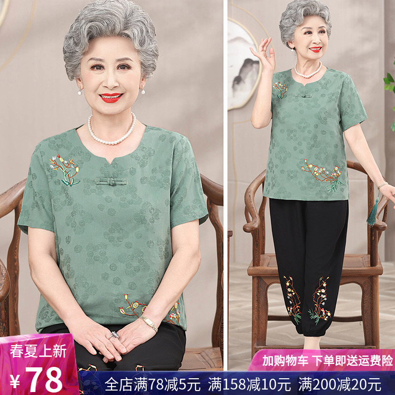 中老年女装妈妈夏装棉麻两件套装时尚洋气短袖t恤衫上衣婆婆衣服