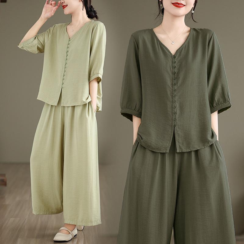 2025新款天丝棉麻套装中老年人女装新中式两件套妈妈夏装短袖上衣