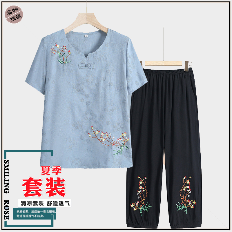 妈妈民族风夏季套装2024新款中老年女复古上衣唐装绣花棉麻两件套