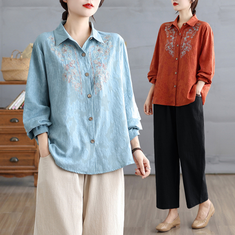 妈妈春夏装新中式薄款套装气质国风中年女长袖衬衫T恤棉麻两件套
