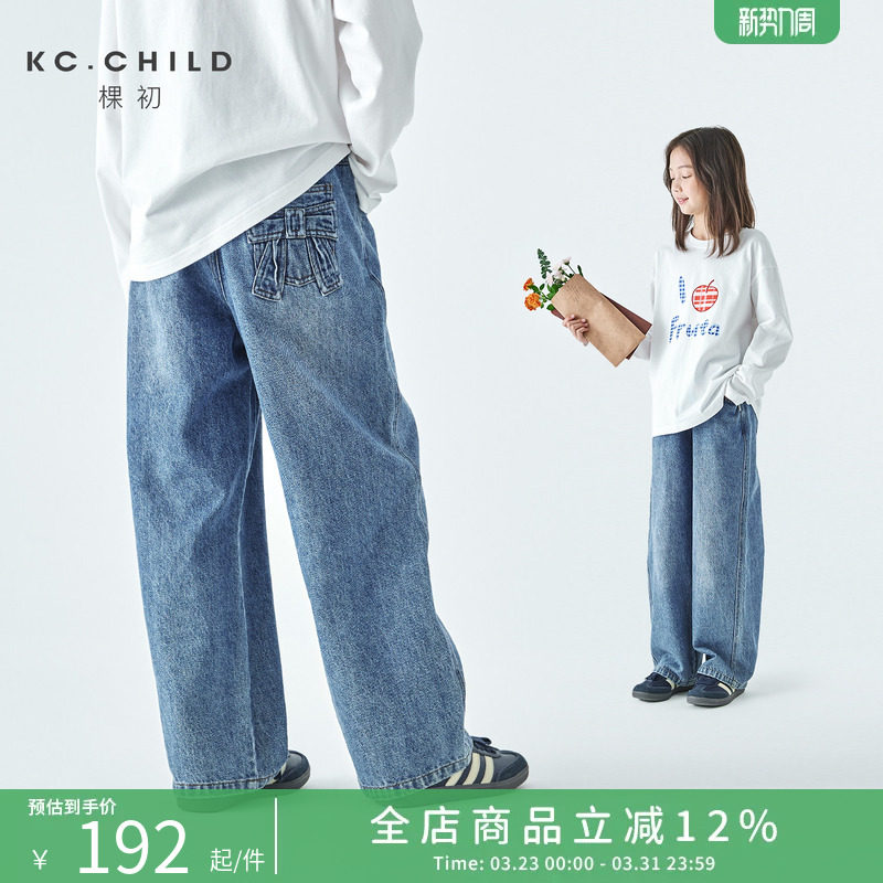 棵初2026年春季新款亲子中大女童立体蝴蝶结长裤水洗蓝纯棉牛仔裤