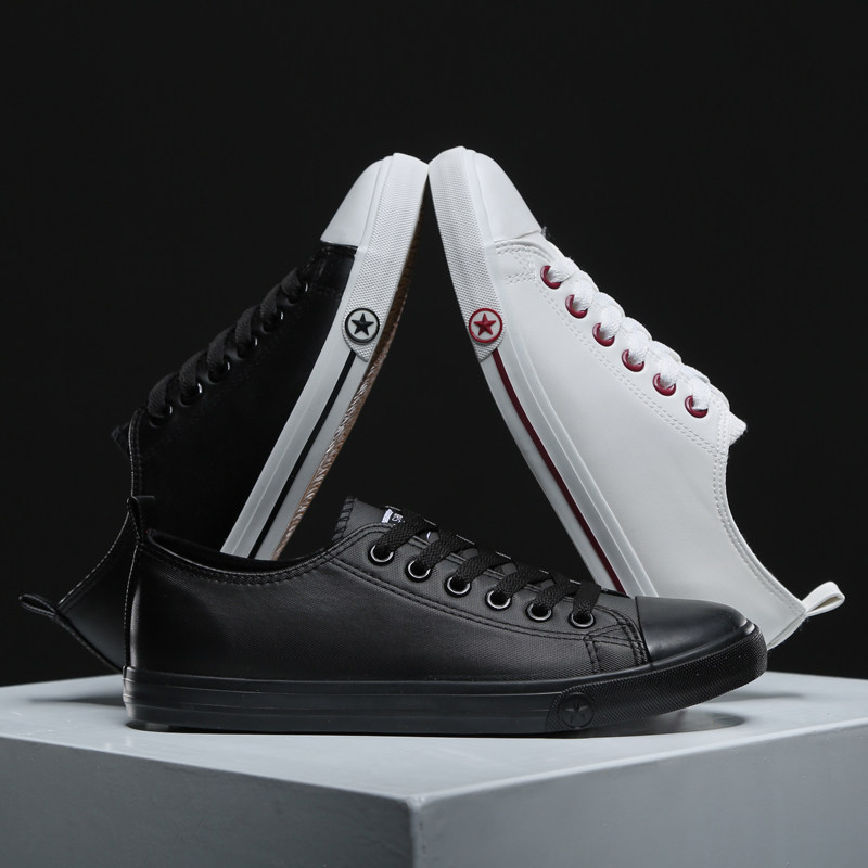 个性学生系带低帮男士帆布鞋皮面男潮鞋子PU防水板鞋休闲韩版百搭