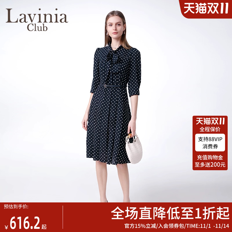 Lavinia波点雪纺连衣裙女2025春新款飘带领泡泡袖设计中长款裙子