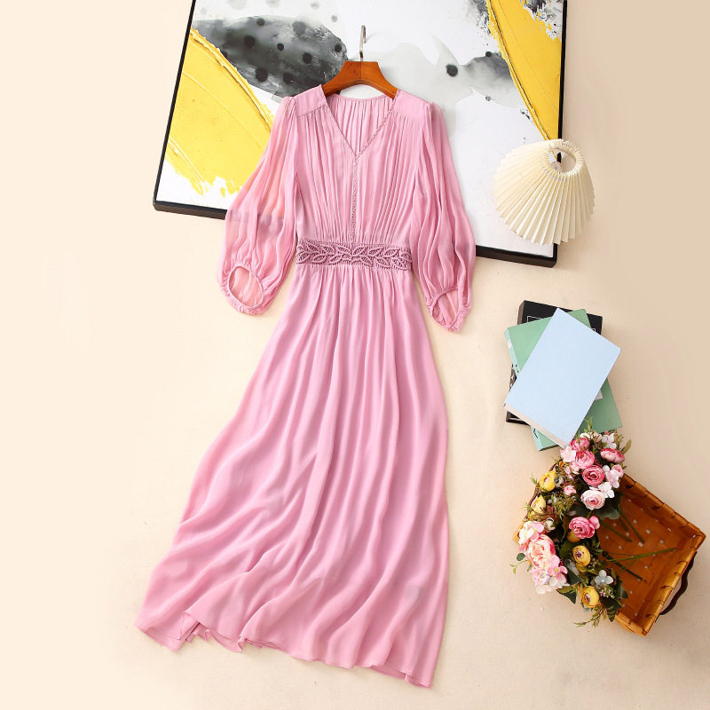 欧洲站夏季新款高端奢华V领勾花真丝裙女100%桑蚕丝温柔风连衣裙