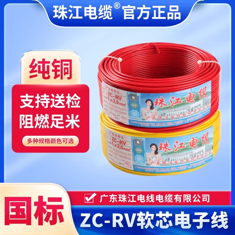 珠江电缆国标ZC-RV1.5/2.5/4/6平方纯铜芯单芯硬线阻燃家装电线