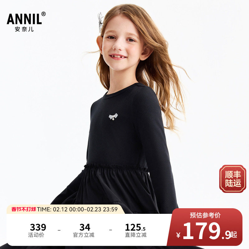 安奈儿童装女童长袖连衣裙2026春新款校园风黑色时尚A字中长裙子