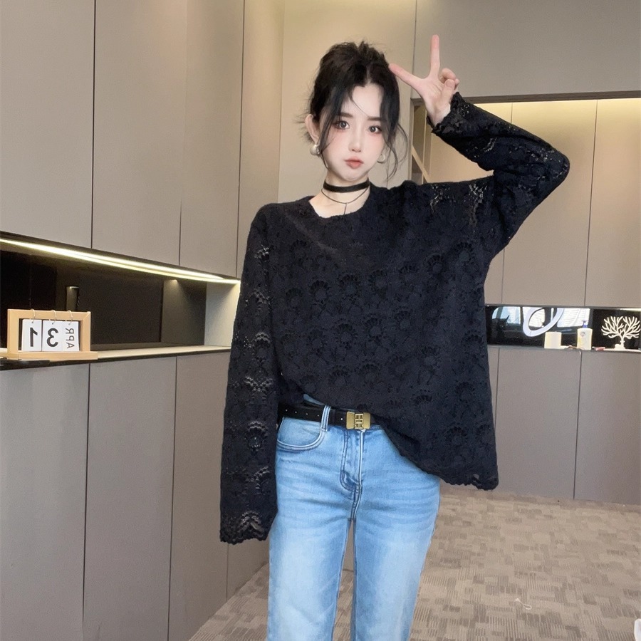 蕾丝衫小衫女2025新款秋冬长袖镂空钩花圆领打底衫高级感上衣欧货