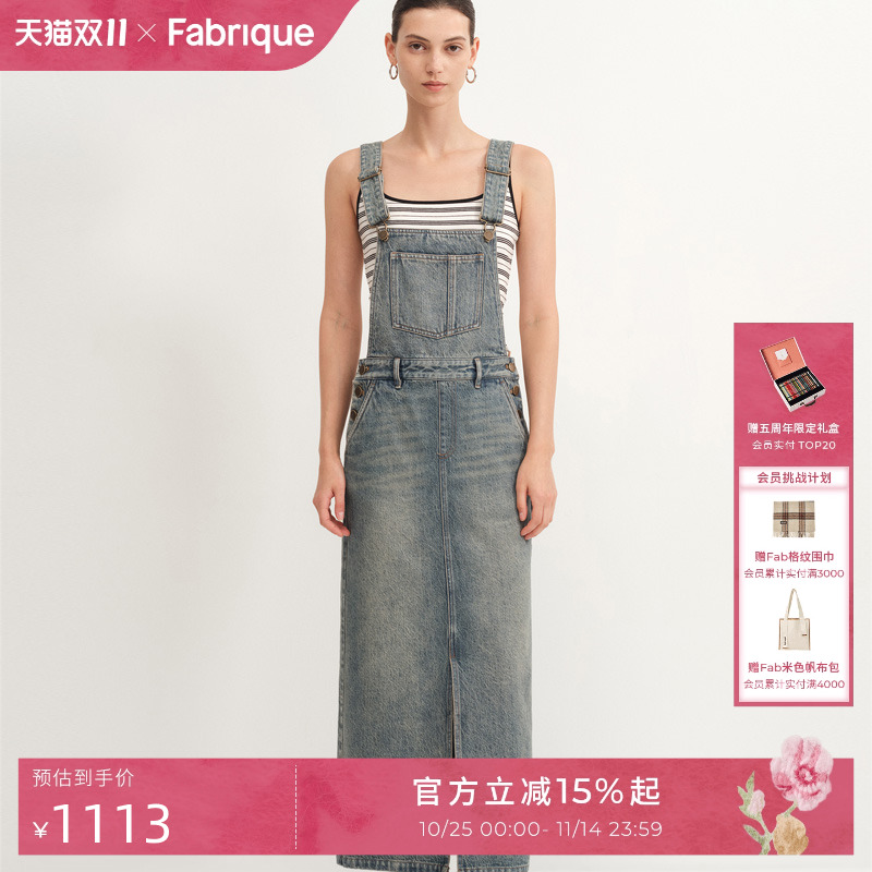 Fabrique 法式复古蓝纯棉前开衩牛仔背带裙2025夏季新品连衣裙女
