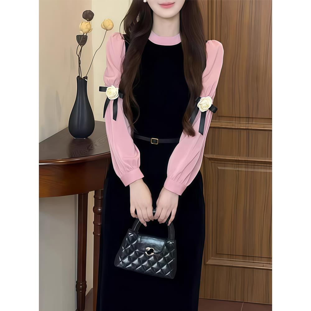 粉红玛琍新品连衣裙两件套女蕾丝收腰后拉链长袖洋装PMALS5558