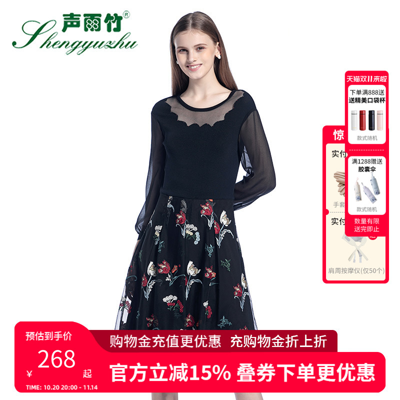 声雨竹专柜同款秋款新品连衣裙 九分袖圆领套头花色甜美中裙A字裙
