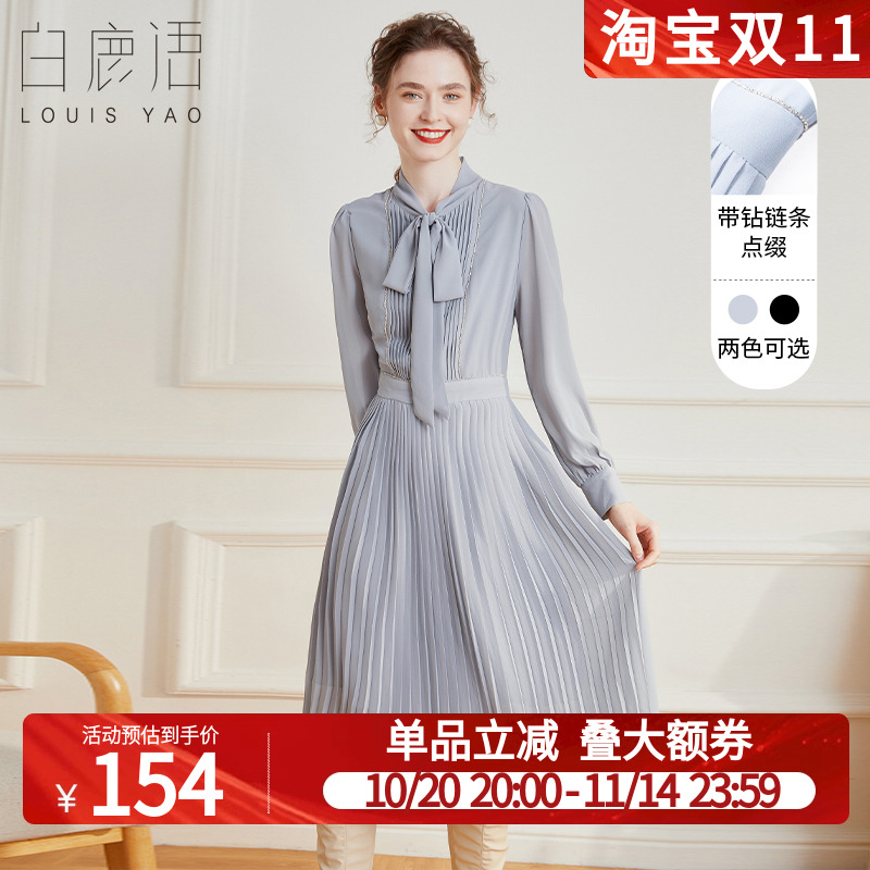 白鹿语气质通勤ol风衬衫裙2025春款长袖系带领连衣裙中长裙百褶裙