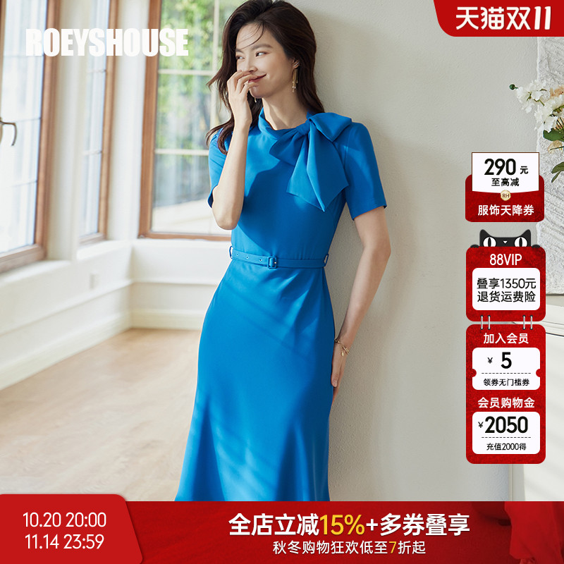 罗衣知性OL系带连衣裙2025夏装新款气质孔雀蓝鱼尾摆中长裙06386