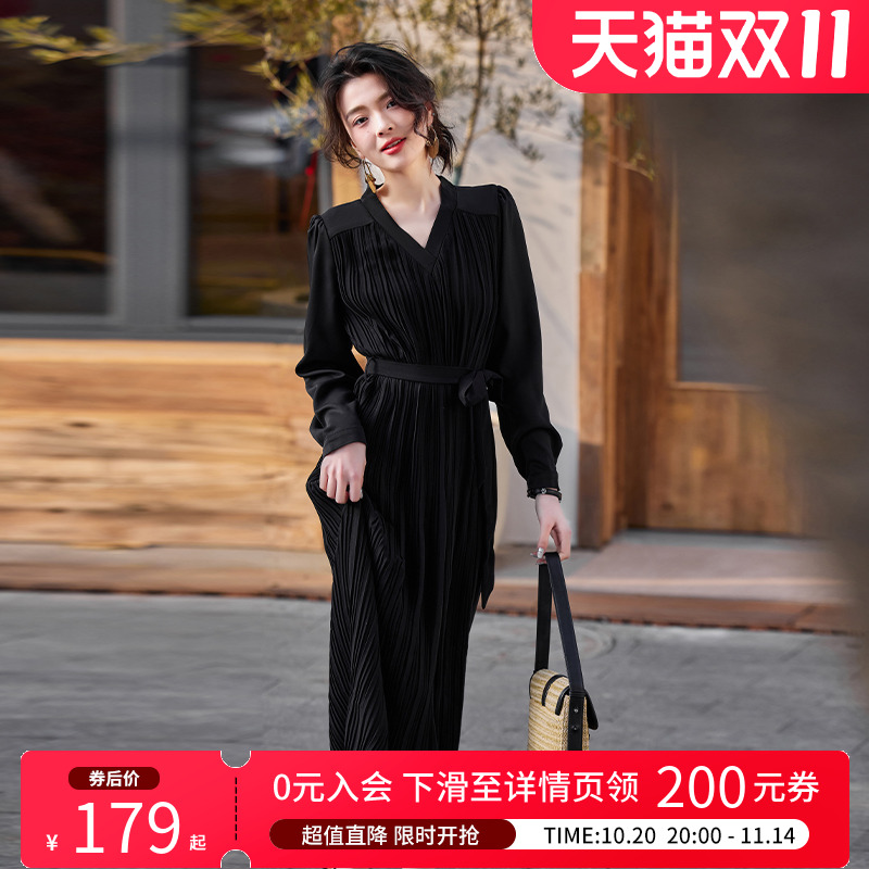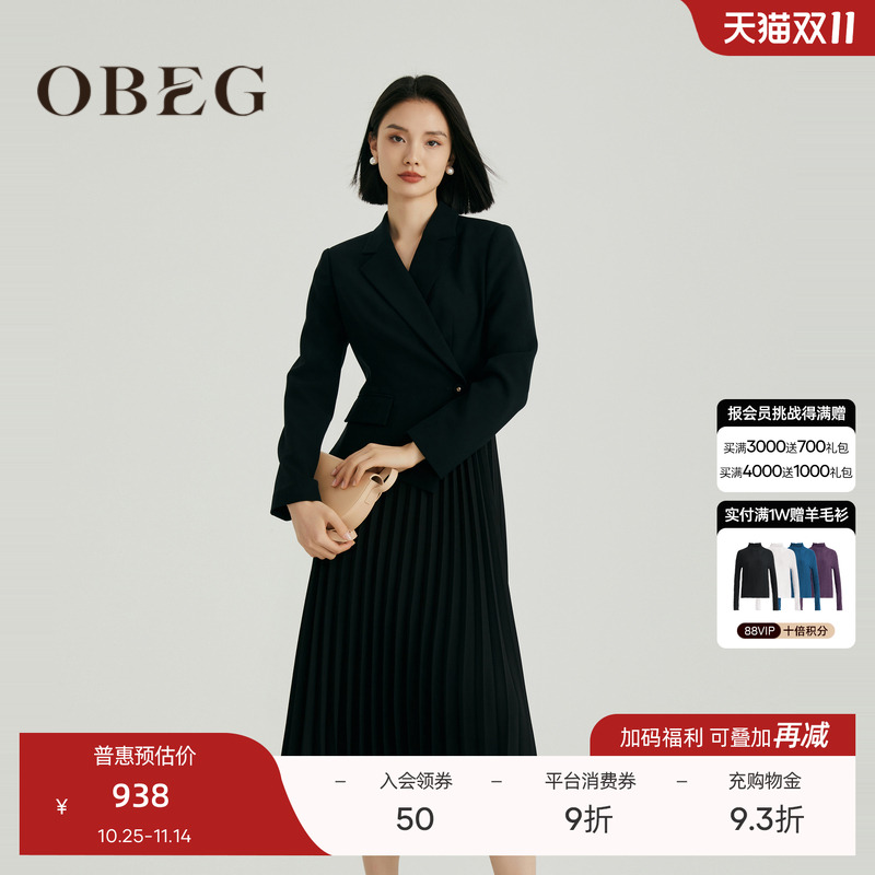 OBEG欧碧倩收腰长袖西装连衣裙女OL百褶长裙10481104