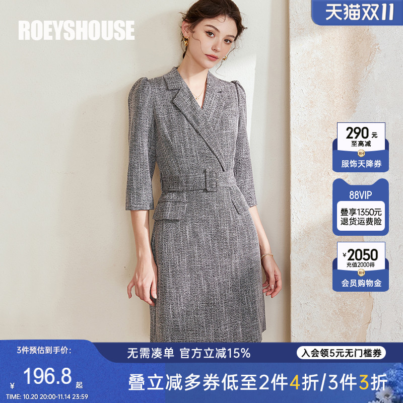 罗衣气质系带西装连衣裙2025秋季新款职业OL花灰色中长裙子05951
