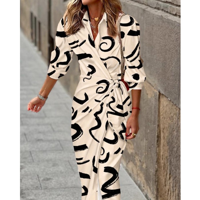 秋季新款欧美时尚通勤OL翻领印花绑带收腰七分袖连衣裙长裙DRESS