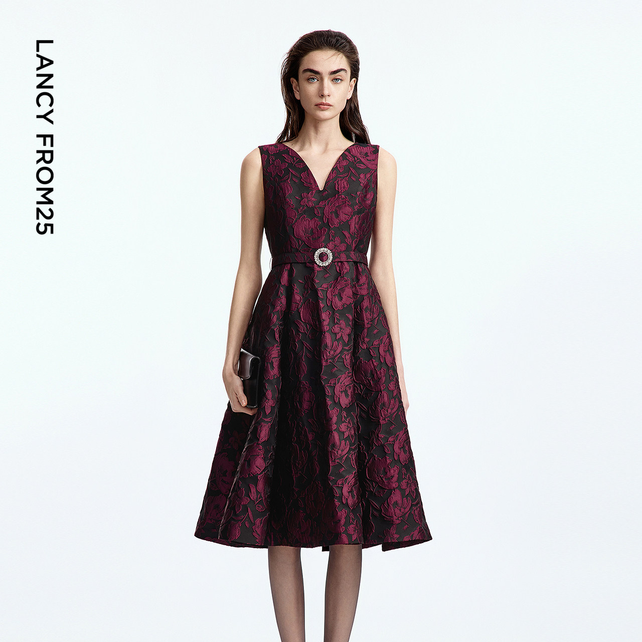 朗姿v领刺绣印花通勤风中长裙气质高级感2025年夏季新款连衣裙女