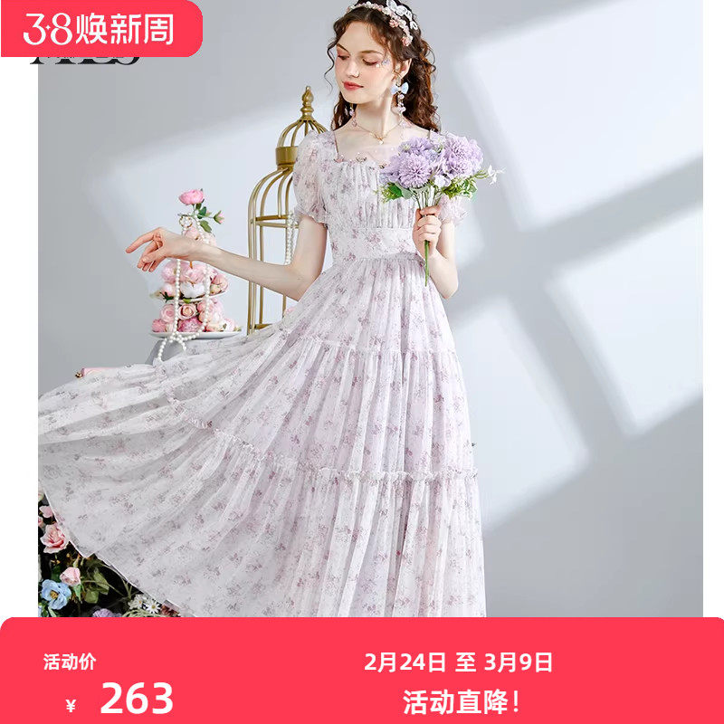 艾丽丝2025夏季新款连衣裙网纱拼接印花中长裙方领甜美短袖仙女裙