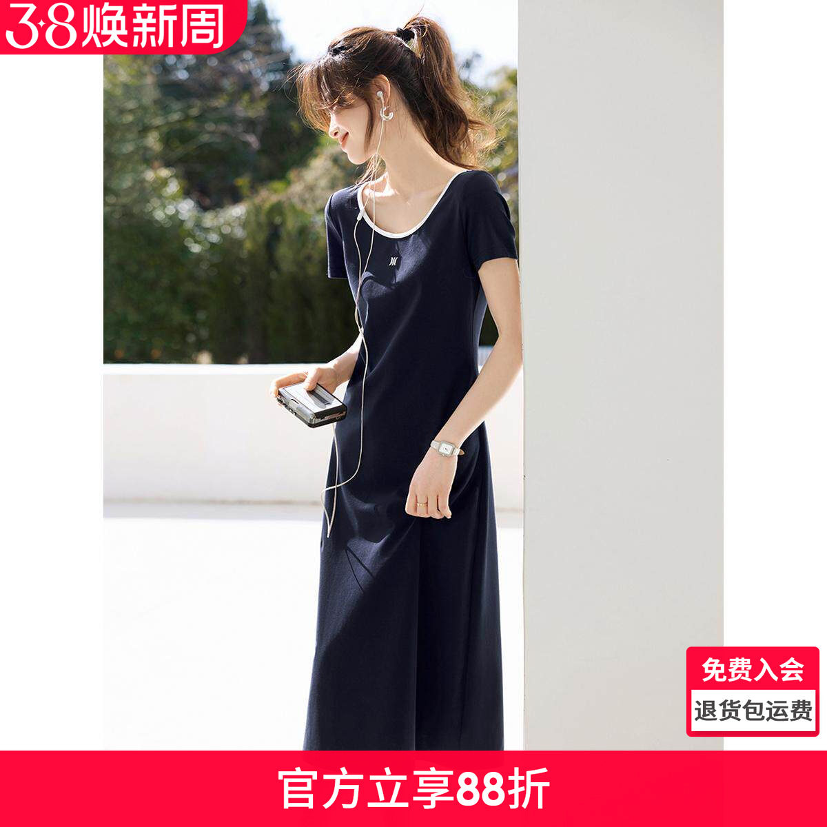 沫晗依美百搭休闲感慵懒大方圆领短袖a字裙2025夏季新款连衣裙女