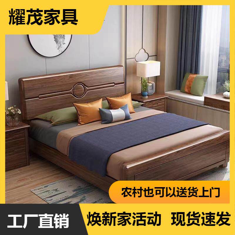 实木床1.8米双人床金丝胡桃木现代简约主卧1.5M中式高箱储物家具