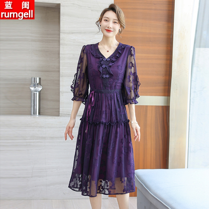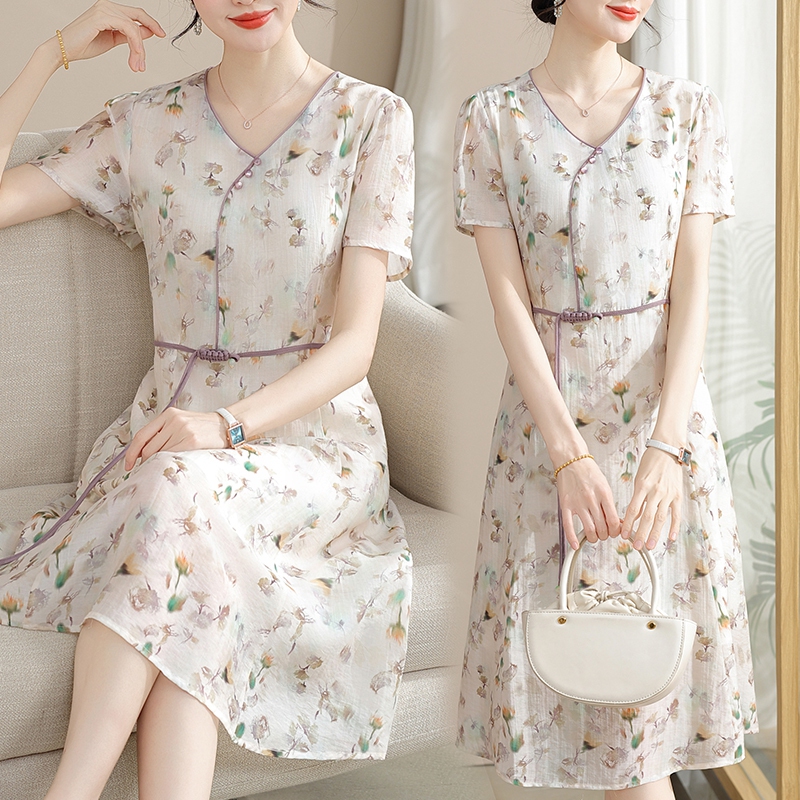 中年妈妈连衣裙夏季新款刺绣中国风雪纺名牌女装改良旗袍盘扣中式