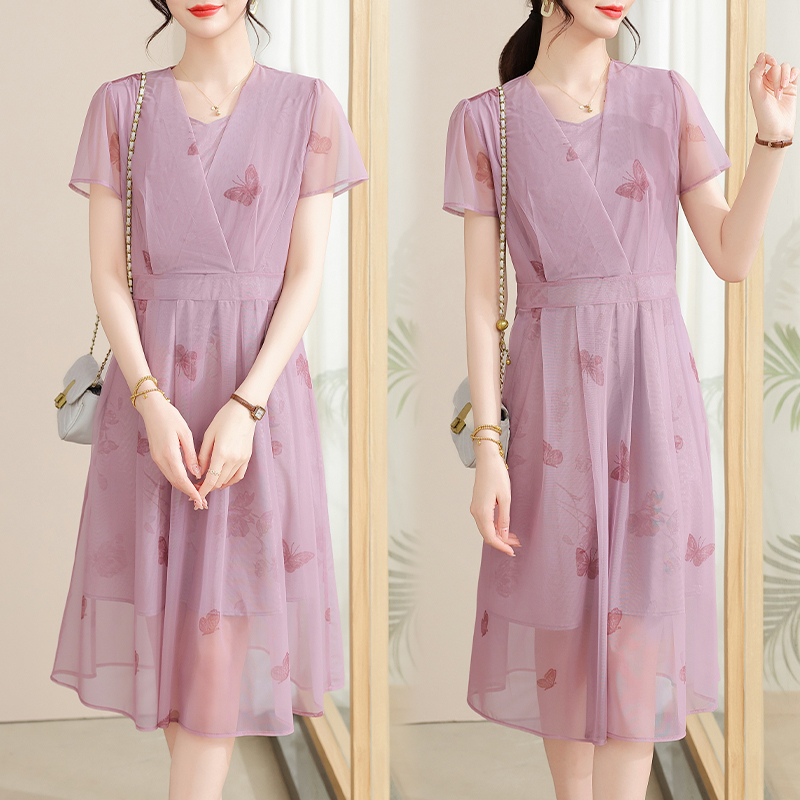 中年妈妈半开领短袖雪纺连衣裙女2025夏装新款阔太太假两件连身裙