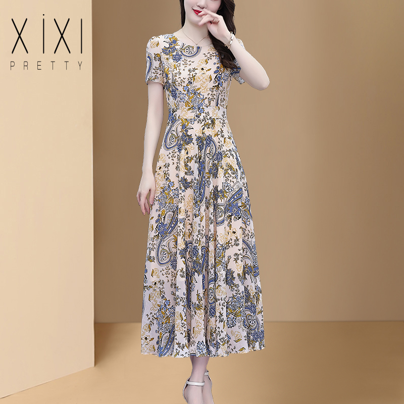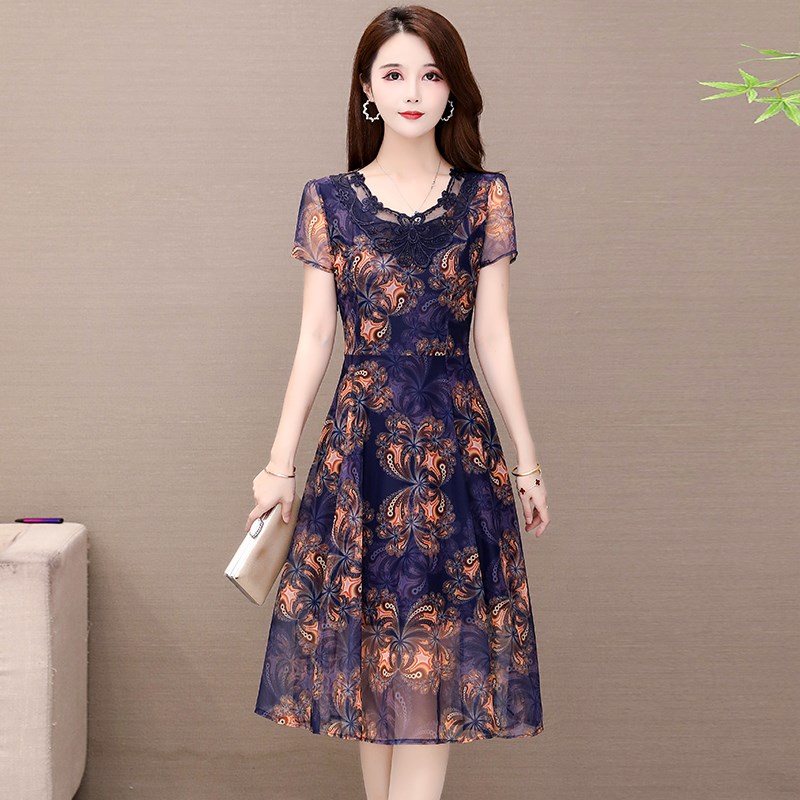 中年雪纺连衣裙女装2024新款夏季显瘦妈妈碎花时尚大码过膝长裙子