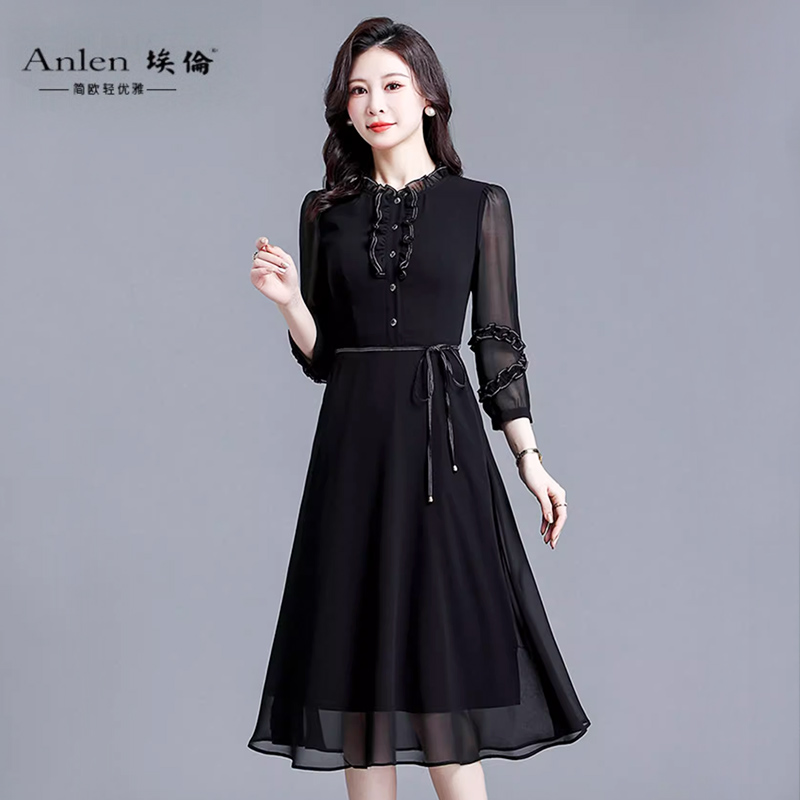 埃伦中年女长袖雪纺连衣裙系带收腰黑色气质显瘦显白2025夏季新款