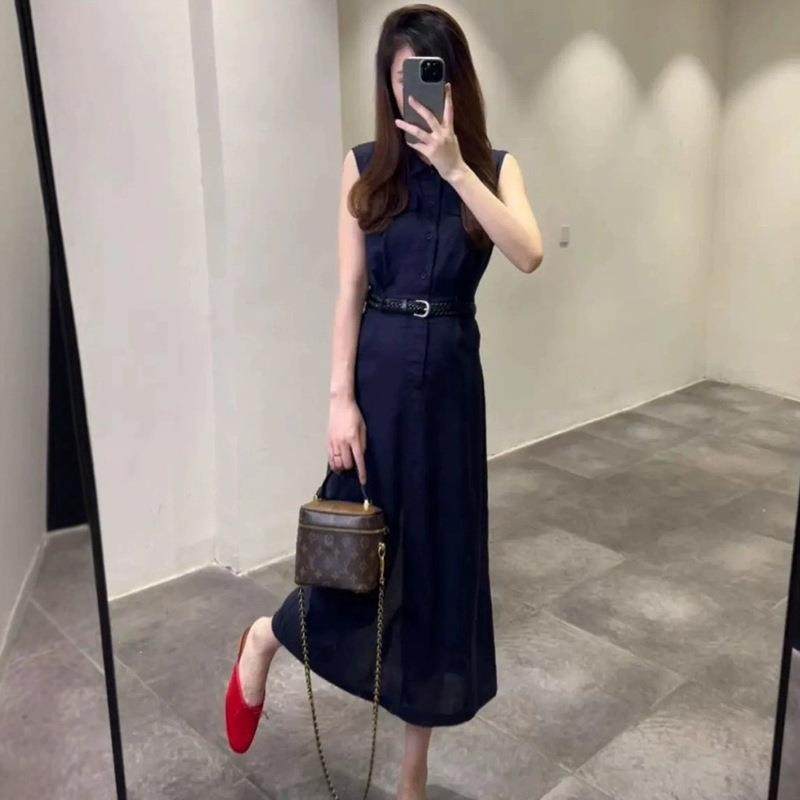 简单大亚麻裙连衣裙71768搭式无袖新款穿藏蓝色南油方法深圳夏女