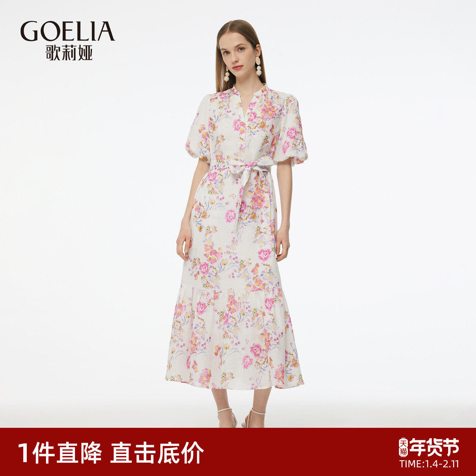 酒午自制【秋藤与杏】港风复古2025秋季新款长款亚麻网印花连衣裙