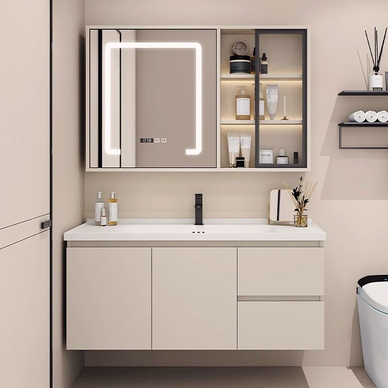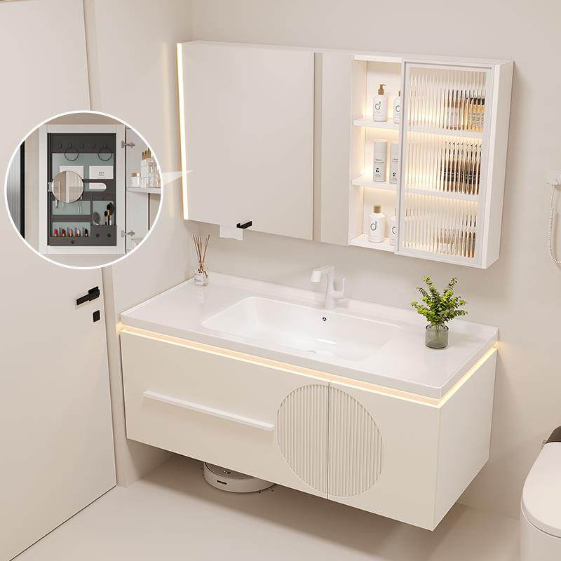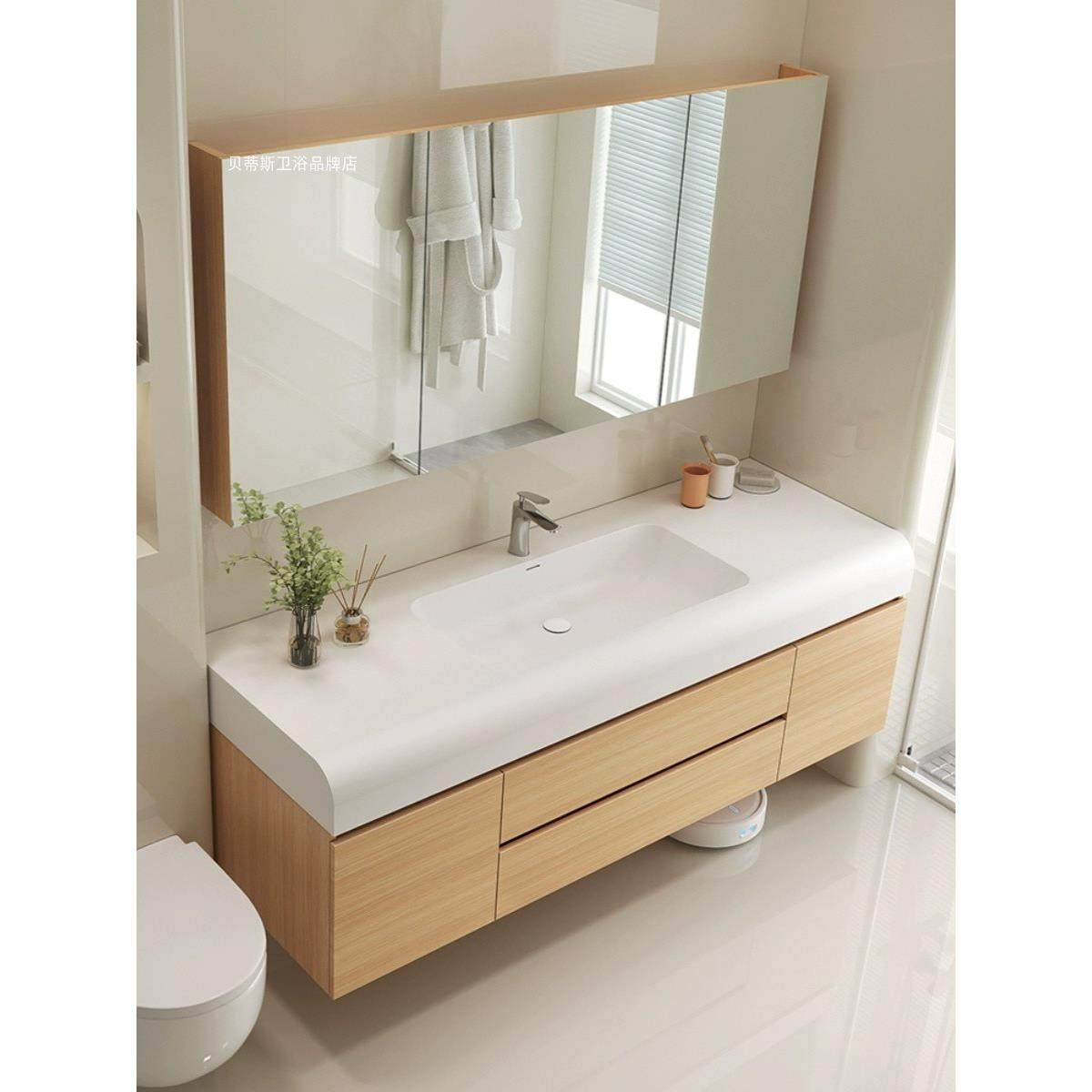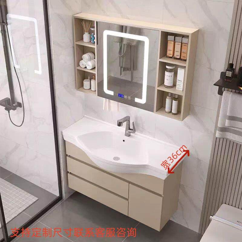 奶油风陶瓷一体盆浴室柜卫生间智能洗手台洗脸盆柜组合实木洗漱台